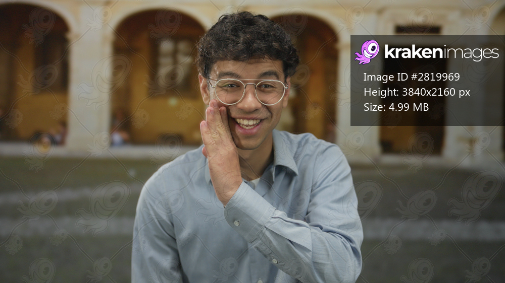 Young hispanic man in glasses cups hand to mouth in front of old stone building under daylight; joy secret.