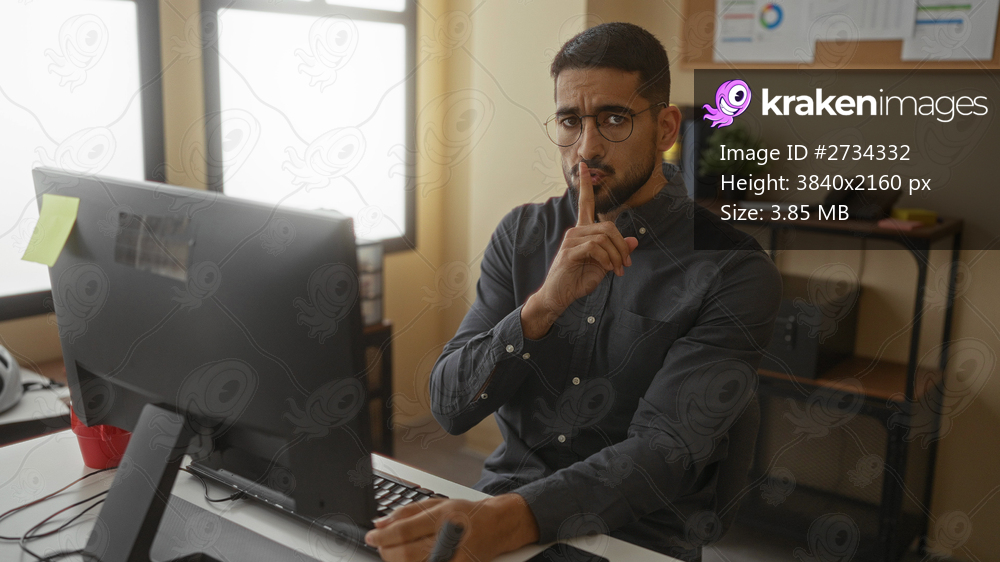Young hispanic man in glasses gestures silently at a computer in a modern office, emphasizing focus and concentration in a professional setting.
