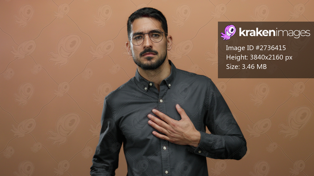 Young hispanic man in glasses with one hand on chest and the other raised against a brown wall, showcasing a gesture of honesty in a studio portrait.