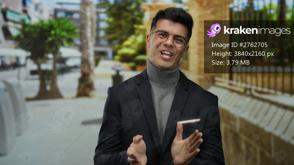 Young hispanic man in glasses smiling and clapping on a city street, wearing a turtleneck and blazer against a sunny urban backdrop.