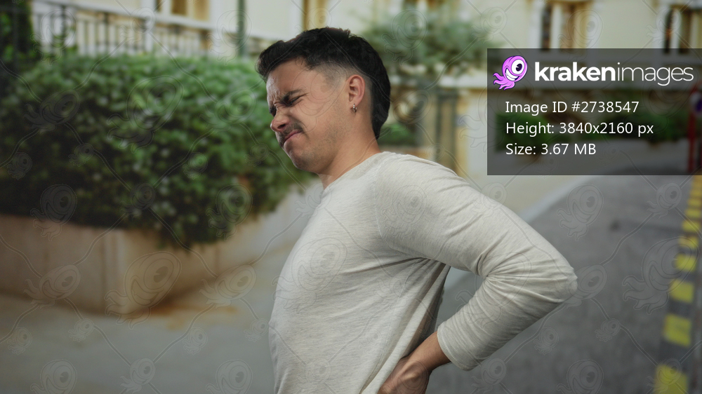 Young hispanic man in gray shirt experiencing back pain stands on a city street outdoors with a pained expression surrounded by urban greenery and buildings. - Kraken Images