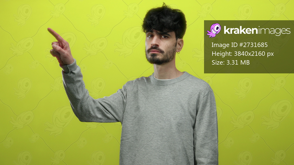Young hispanic man in gray sweater pointing on isolated yellow background showing focus and attention concept
