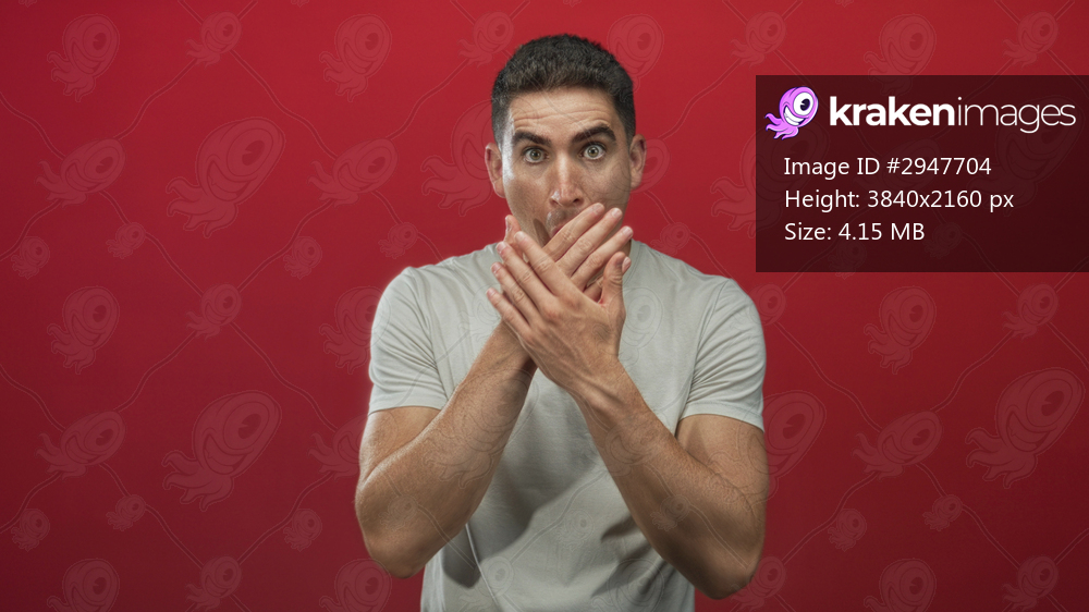 Young hispanic man in gray tshirt with hands covering mouth in red studio; surprise secrecy hush secret.