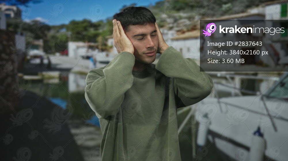 Young hispanic man in green sweater covers ears with hands by white sailboat at sunlit port; serenity.