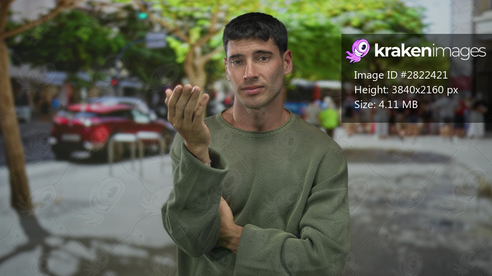 Young hispanic man in green sweater with hand on chin and arm folded on crowded city street; contemplation.
