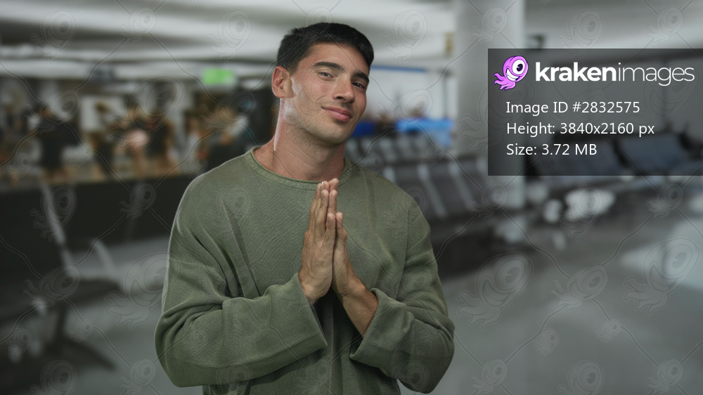 Young hispanic man in green sweater with hands clasped praying peacefully in busy airport terminal with blurred seating area; serenity.