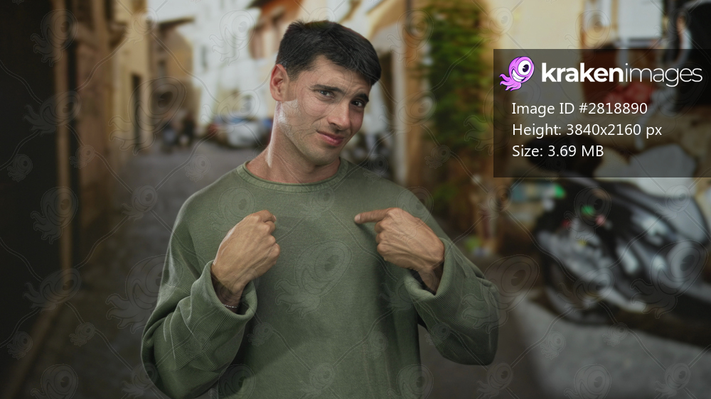 Young hispanic man in green sweater pointing finger at himself with slight smile in old town street; confidence.
