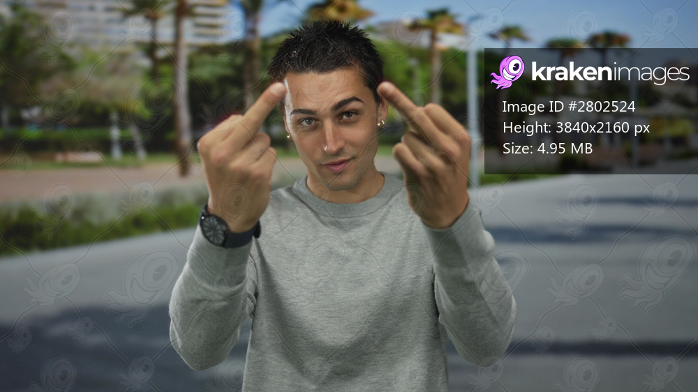 Young hispanic man in grey sweater shows both bare middlefinger gestures to camera on urban street; defiance.