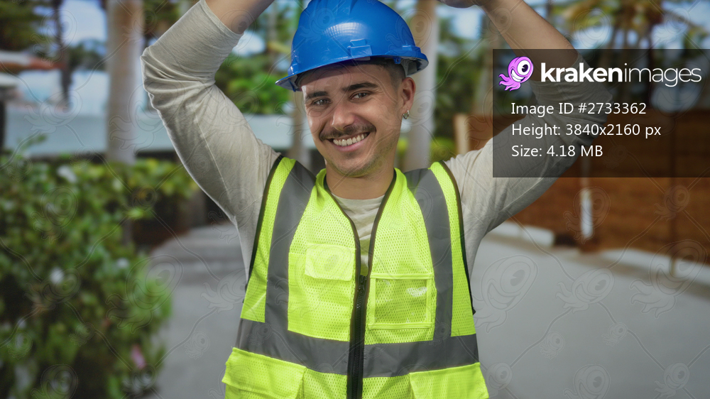 Young hispanic man in hardhat and reflective vest gestures roof-like gesture outdoors, standing in a city street setting, surrounded by urban elements and greenery. - Kraken Images