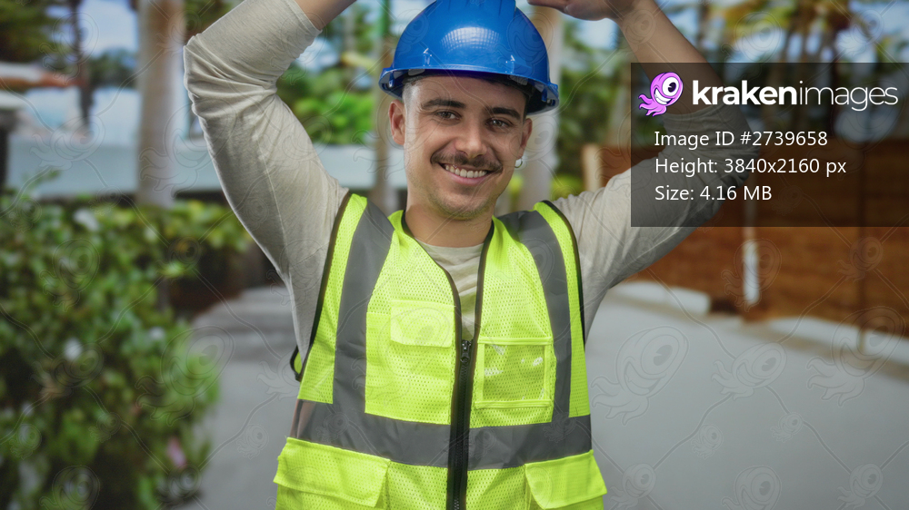 Young hispanic man in hardhat and reflective vest gestures roof-like gesture outdoors, standing in a city street setting, surrounded by urban elements and greenery. - Kraken Images