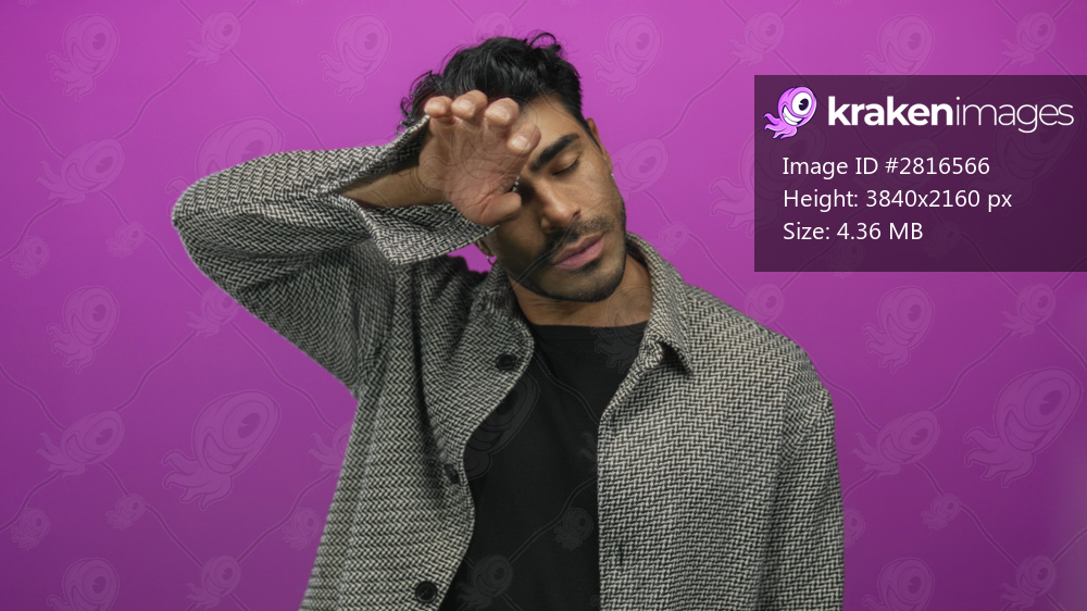 Young hispanic man in herringbone jacket wipes sweat from forehead over vivid magenta studio backdrop; fatigue.