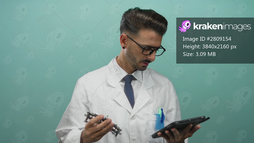 Young hispanic man in lab coat holds metallic engine component and reads digital tablet in teal studio; focus.