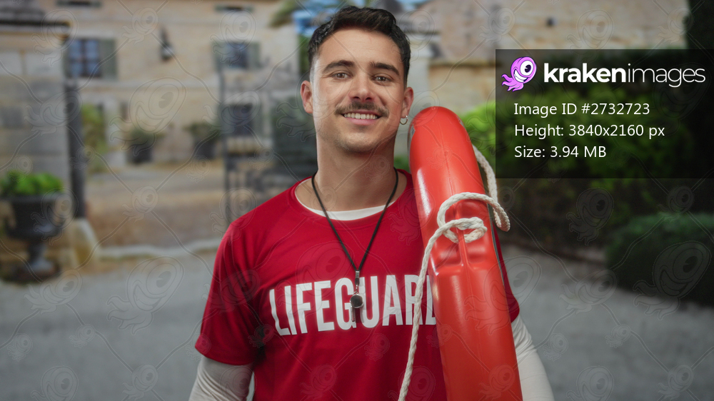 Young hispanic man in lifeguard shirt with buoy on city street, smiling outdoors in vibrant urban setting with lush greenery.
