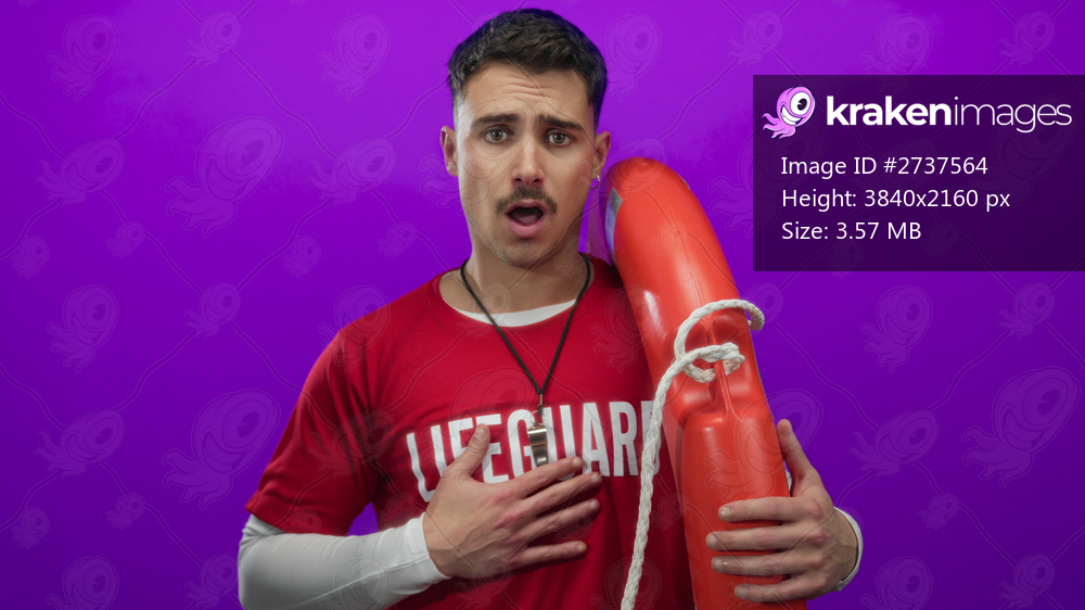 Young hispanic man in lifeguard shirt holding float with concerned expression against purple background, conveying urgency and readiness.