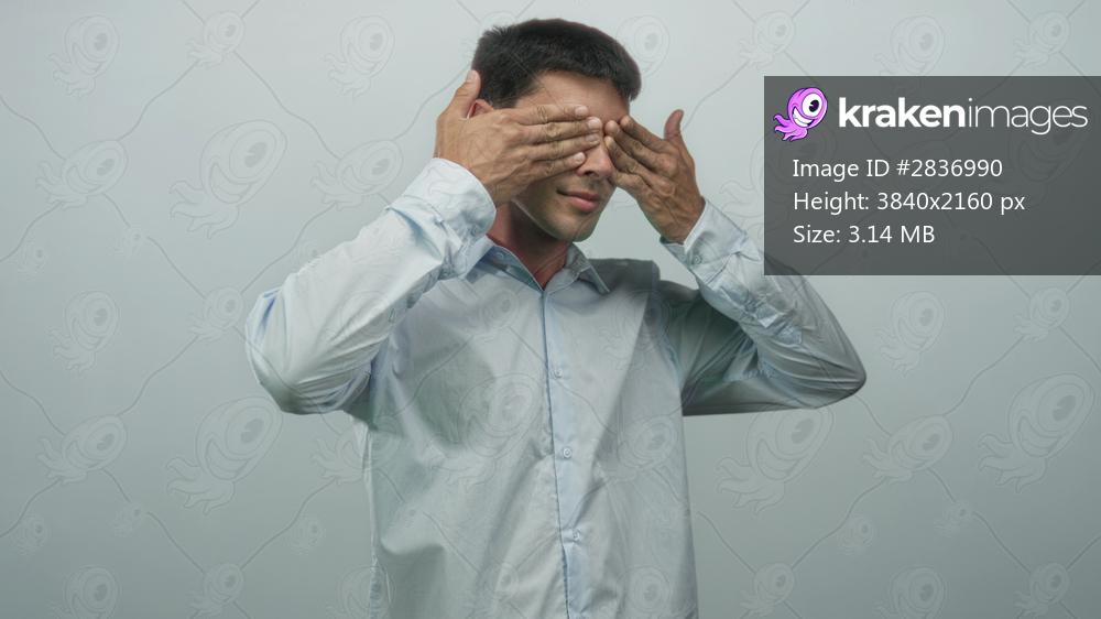 Young hispanic man in light blue shirt covers eyes with both hands against light grey background in studio; stress.