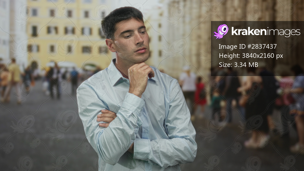 Young hispanic man in light blue shirt hand on chin on old town cobblestone street; doubt contemplation.