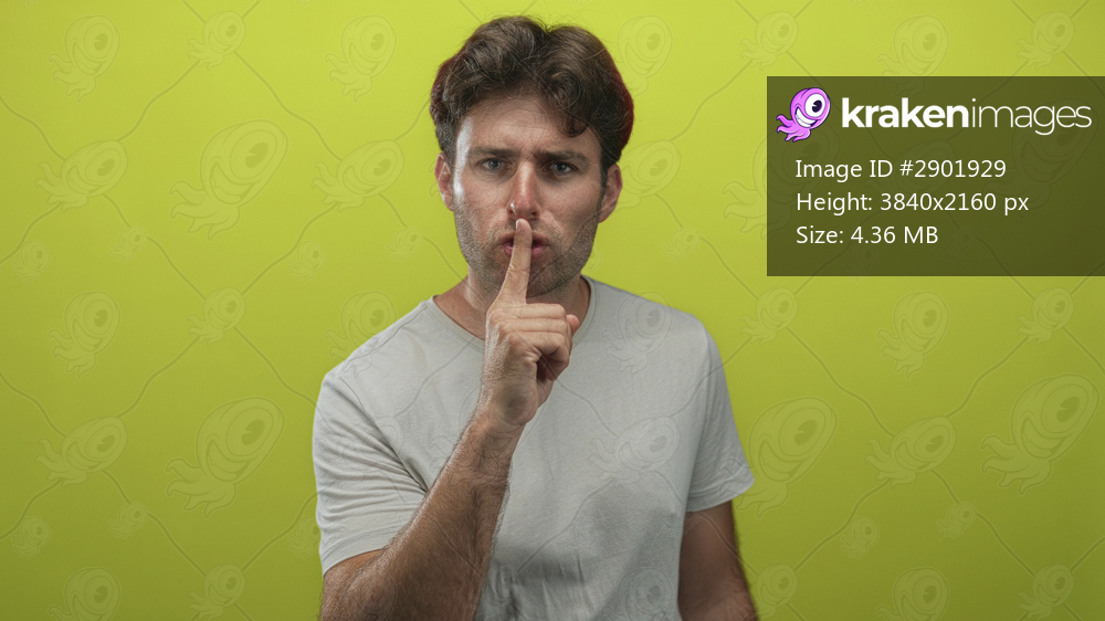 Young hispanic man in light grey tshirt with finger to lips for silence in lime green studio; quiet secrecy.
