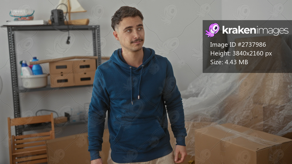 Young hispanic man in new apartment surrounded by moving boxes looking excited as he embraces his fresh start indoors.