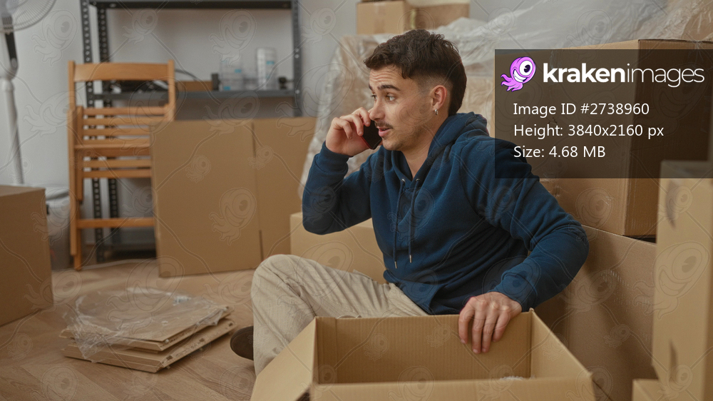 Young hispanic man in new home surrounded by boxes talking on phone in living room apartment interior unpacking