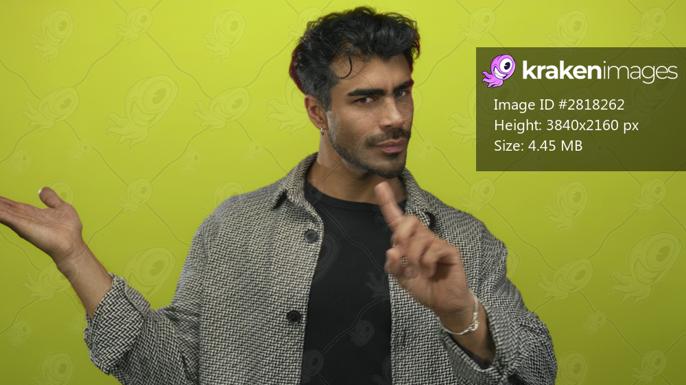 Young hispanic man in patterned jacket holds open palm and points finger in yellow studio; uncertainty.