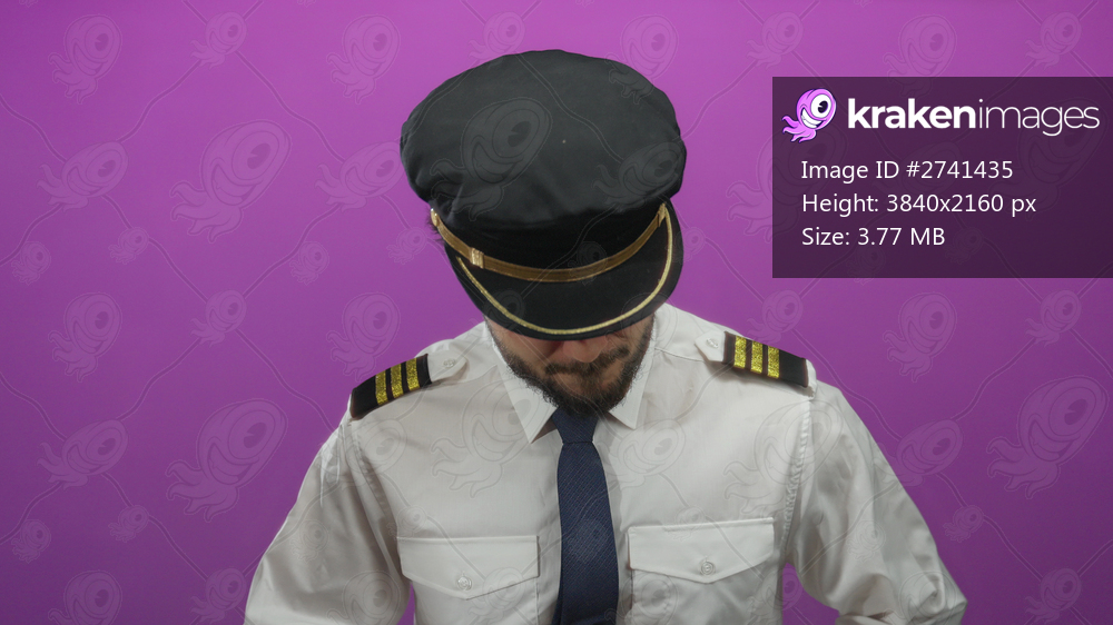 Young hispanic man in pilot uniform with cap looking down against pink background