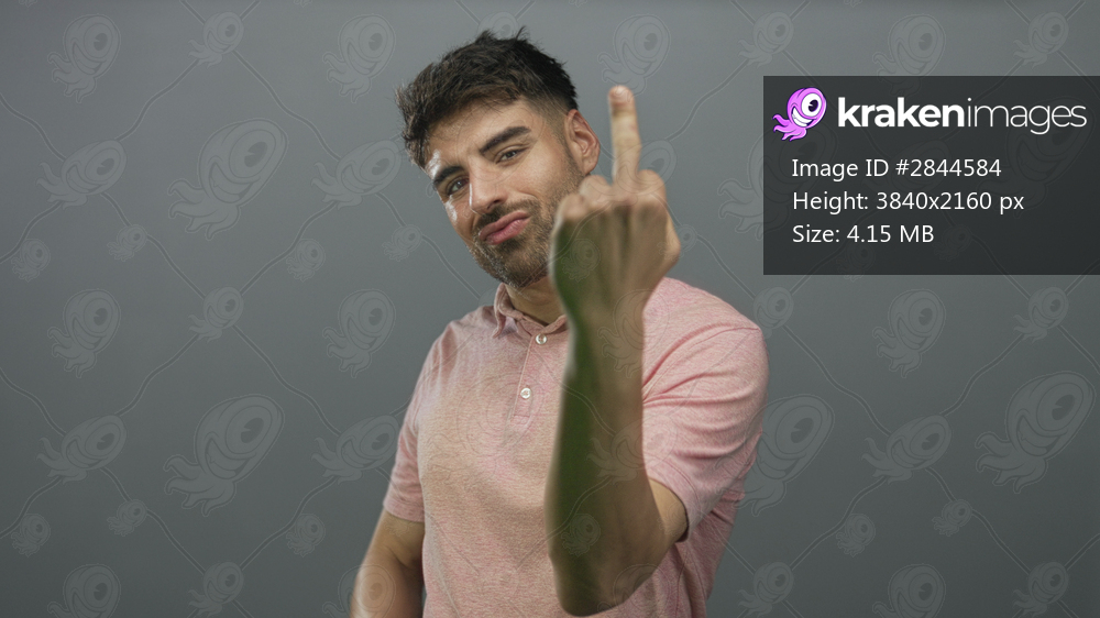 Young hispanic man in pink polo shirt shows middle finger with clenched fist facing camera in grey studio; rebellion.
