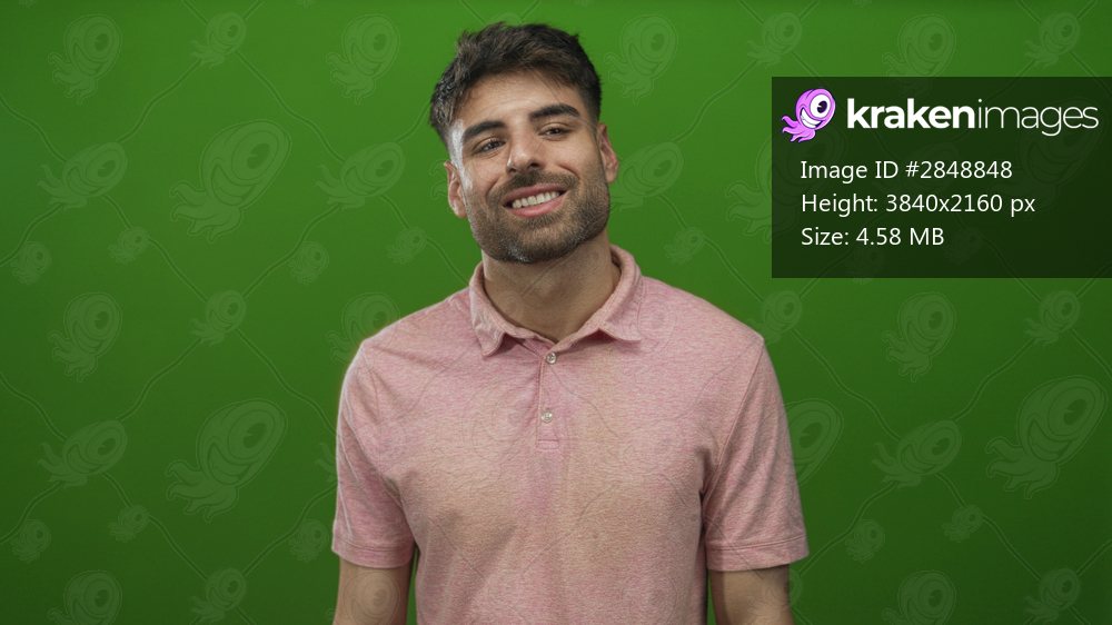 Young hispanic man in pink polo shirt smiles with slight head tilt in green studio setting; confidence.