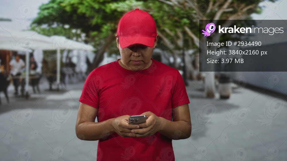 Young hispanic man in red cap and red shirt holding smartphone with both hands, looking down at screen on busy street cafe; focus duty reliability.