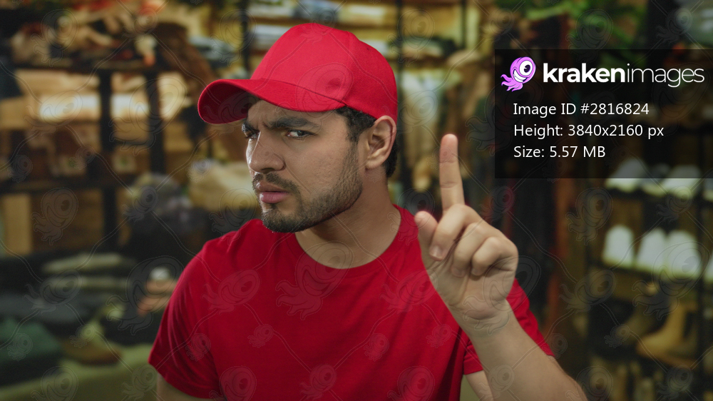 Young hispanic man in red cap and shirt points finger to ear and frowns inside a building; confusion uncertainty doubt questioning.
