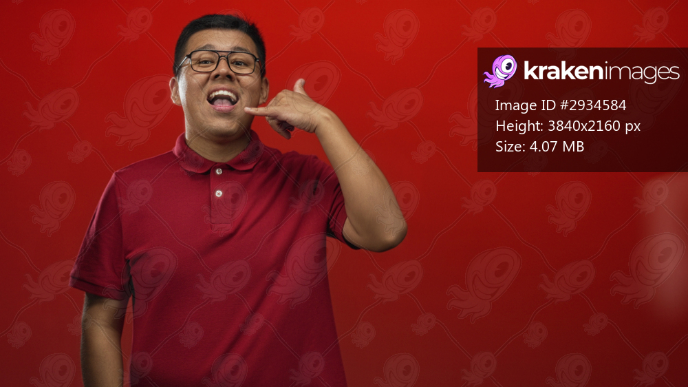 Young hispanic man in red polo with glasses, hand to ear for call gesture in studio red background; playful connection.