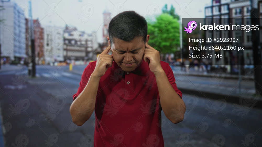 Young hispanic man in red polo shirt with hands covering ears on a busy city street; sensory overload stress.