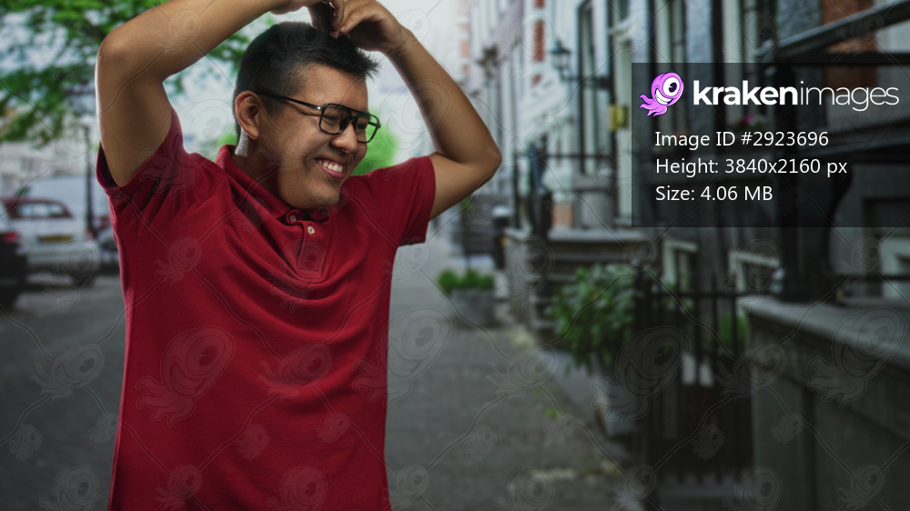 Young hispanic man in red polo wearing glasses, smiling with hands forming heart over head on street; joy connection warmth.