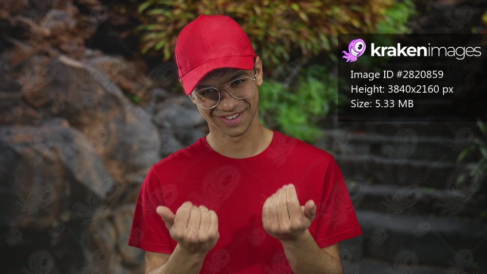 Young hispanic man in red shirt and cap cups both hands in beckoning gesture in forest; warm invitation.
