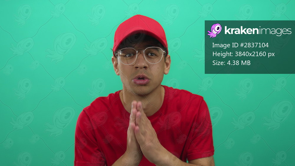 Young hispanic man in red shirt and cap holds hands pressed in prayer gesture in green studio; hope.