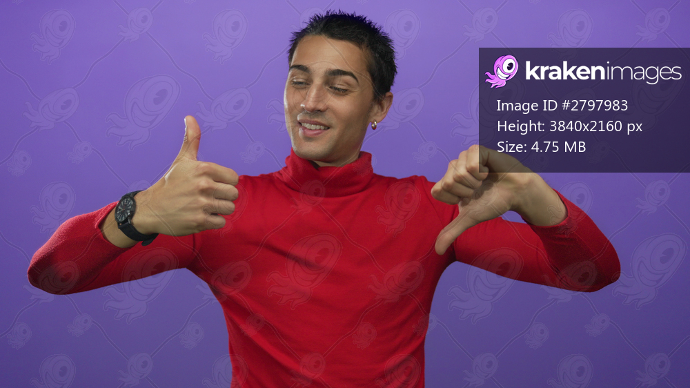 Young hispanic man in red shirt gesturing thumbs up and down against isolated purple background wall.