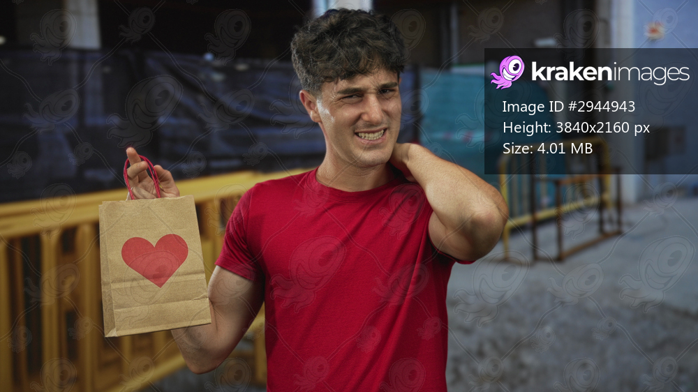 Young hispanic man in red shirt holds red paper bag with heart and hand on neck at building, grimacing with tense jaw and awkward posture; surprise discomfort. - Kraken Images
