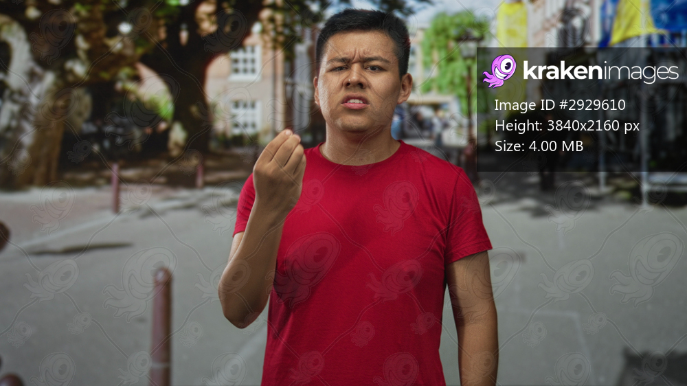 Young hispanic man in red shirt making pinched fingers gesture and frowning, bare hand raised on street with trees and buildings; frustration.