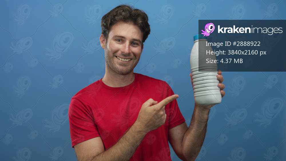 Young hispanic man in red shirt pointing finger at white plastic bottle in blue studio, smiling at camera; cheerful product promotion.