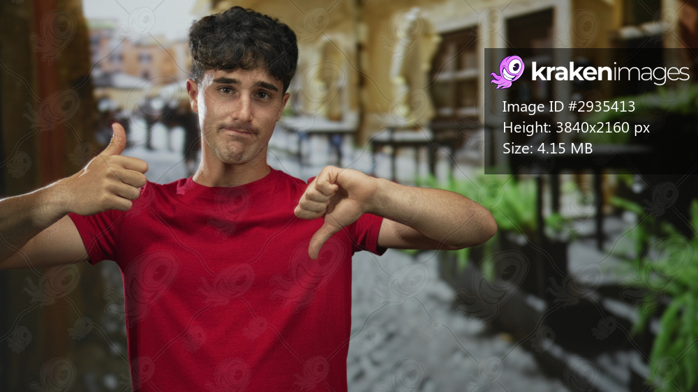 Young hispanic man in red shirt showing thumbs up and thumbs down in a cobblestone street cafe setting; ambivalence.