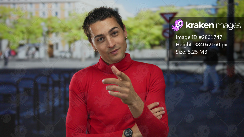 Young hispanic man in red turtleneck with crossed arms on urban street lined with trees and metal railings; rejection isolation.
