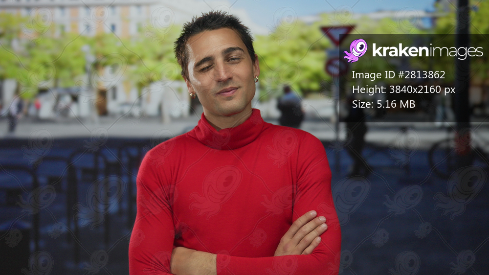 Young hispanic man in red turtleneck with crossed arms on urban street lined with trees and metal railings; rejection isolation.