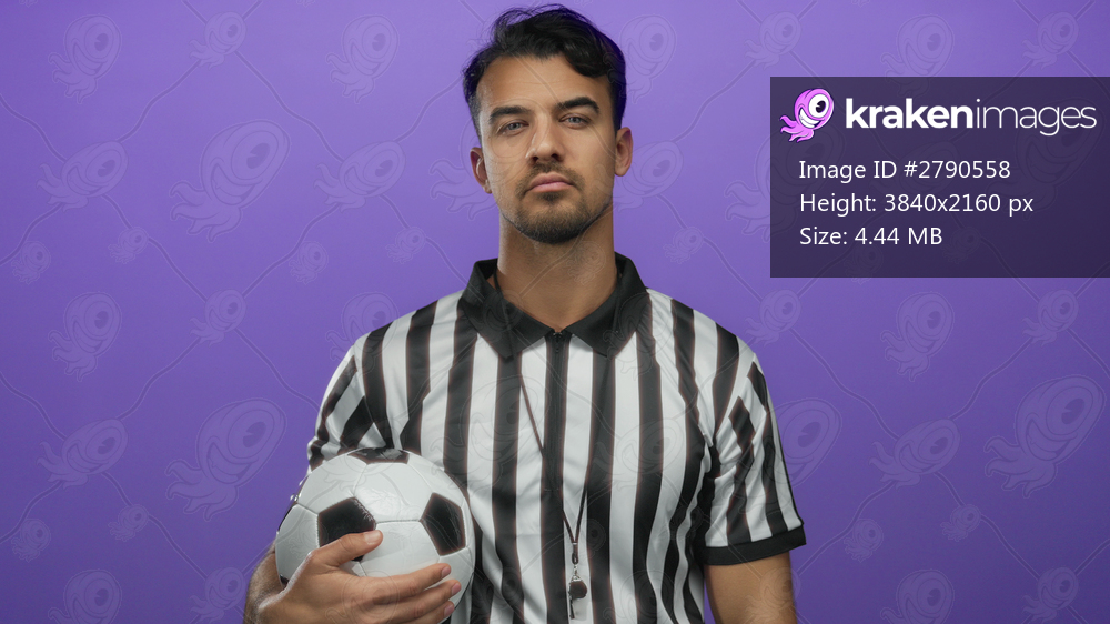 Young hispanic man in referee uniform holding a soccer ball against a vibrant purple background, conveying a sense of authority and focus in sports.