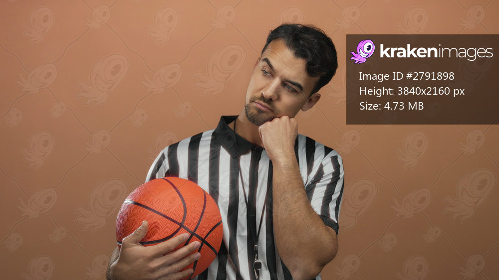 Young hispanic man in referee uniform holding basketball on brown background appears pensive and thoughtful, isolated with a serious expression.