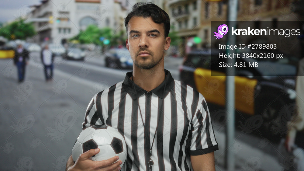 Young hispanic man in referee uniform holding soccer ball standing on city street with blurred urban background, highlighting the dynamic outdoor environment. - Kraken Images