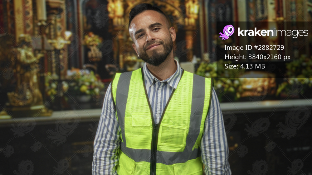 Young hispanic man in reflective safety vest placing hand on chest in a church building; faith gratitude.