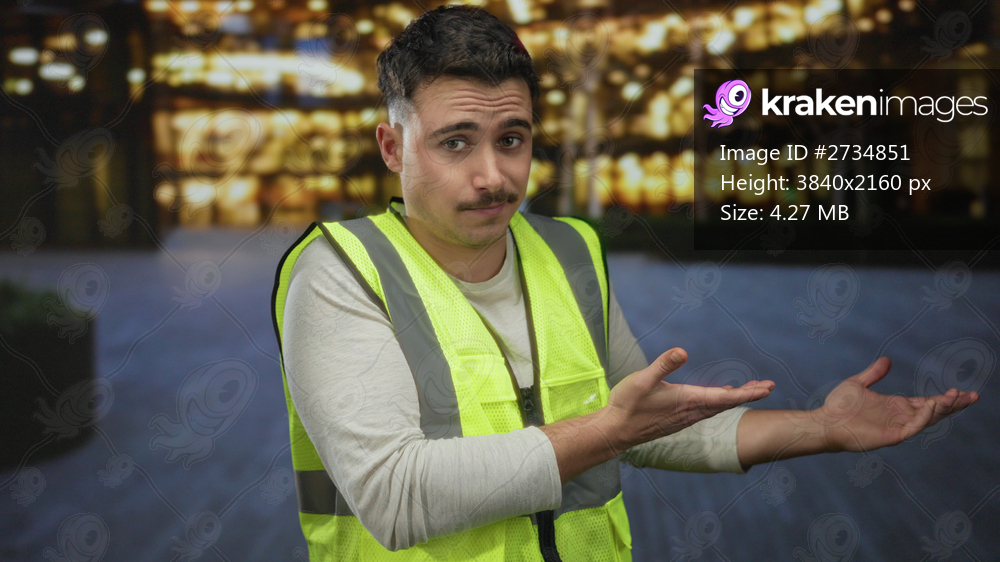 Young hispanic man in reflective vest gesturing on a city street at night, illuminated by urban lights, conveying direction and focus in an outdoor environment. - Kraken Images