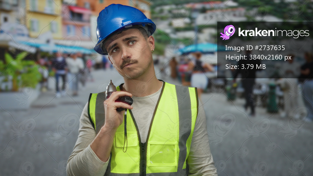 Young hispanic man in reflective vest and hardhat holds drill on city street, suggesting urban construction work among passersby and busy outdoor setting. - Kraken Images