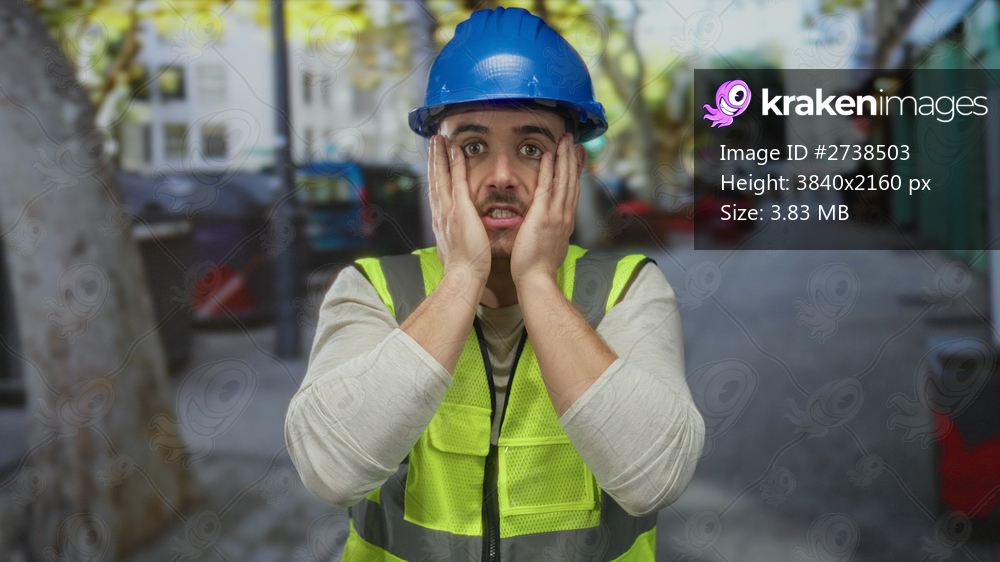 Young hispanic man in reflective vest and hardhat stands on a city street appearing thoughtful while surrounded by outdoor urban elements suggesting construction work. - Kraken Images