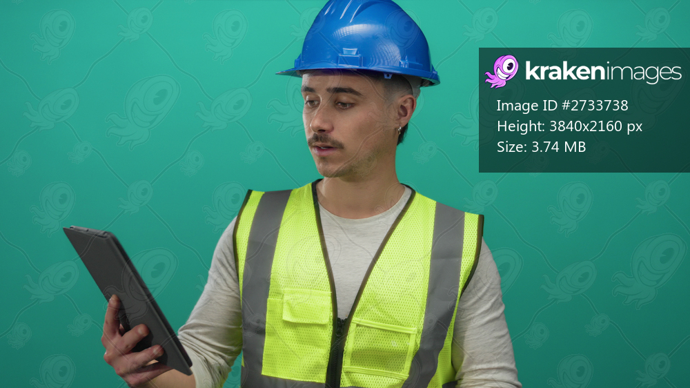 Young hispanic man in reflective vest and hardhat using tablet against isolated green background wall.