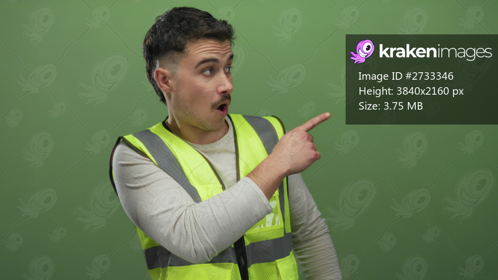 Young hispanic man in reflective vest points to side with surprised expression against isolated green wall background.